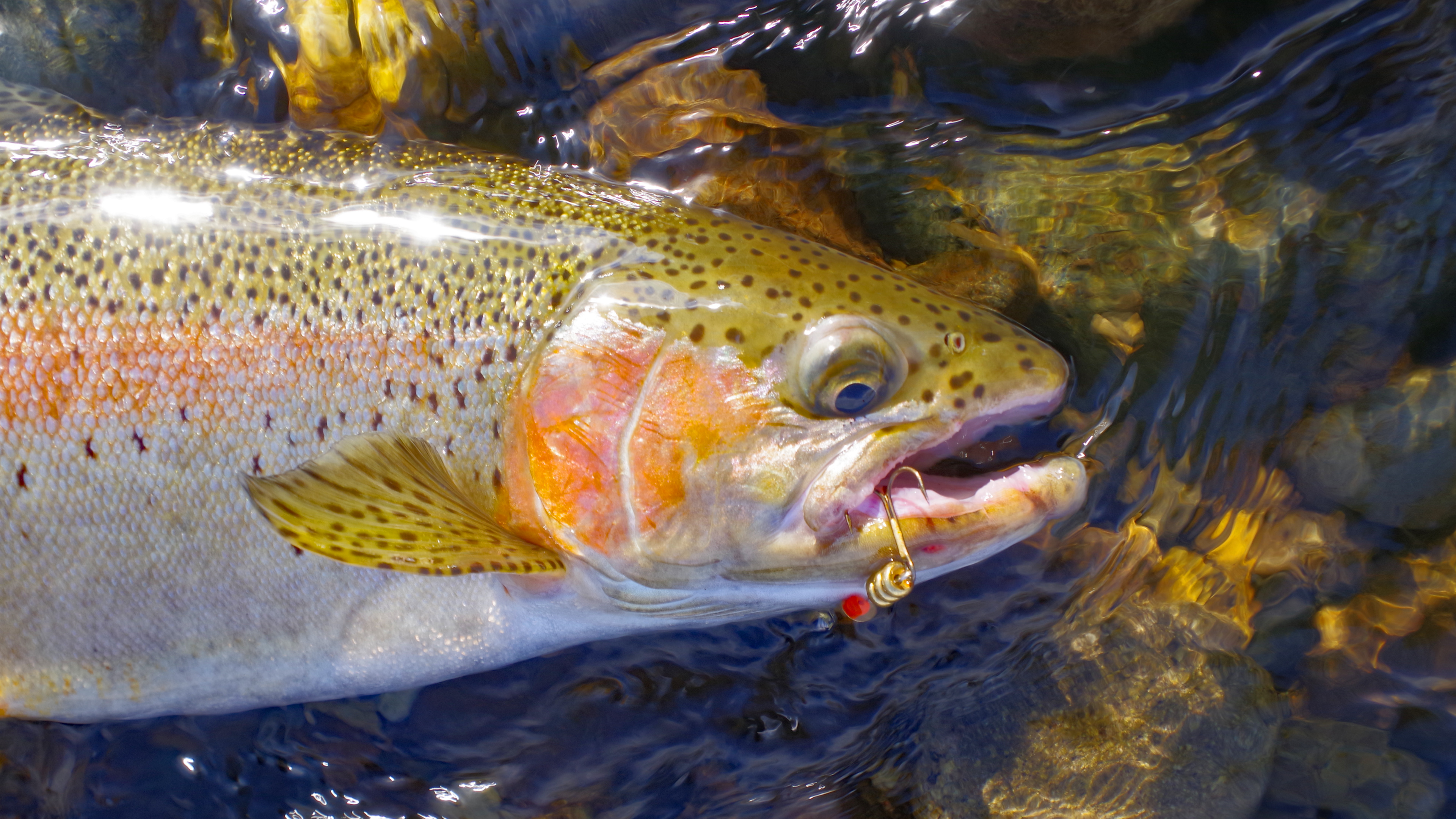 ブレットンを咥えた 十勝の良型ニジマス(45p)