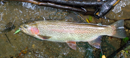 4-7.釣り方 他のスポーツや技能でもそうですが、細かなノウハウの蓄積と経験による鍛錬が、良い結果を産むためには必要です。また、人それぞれの得意が有り、他人の釣り方をそのまま真似ても、良い結果を産むとは限りません。そのため、全てをこの様なマニュアルに書き切れるものではありません。ぜひ、多くの釣りの経験を重ねられ、ノウハウ獲得と鍛錬を積まれる事を願います。 違法な網や毒流しなど、ニジマスに限らない一般的な河川での禁止事項は守る必要がありますが、自然河川でのニジマス釣りに限った、法的な裏付けのあるルールはありません。ルアーロッドでスプーンにフライを繋げて投げる人や、フライに餌を付けて釣る人など、様々です。釣り方は自由ですが、ぜひご自分の納得の行く、こだわりの釣り方でお楽しみください。 4-7-1.ルアーフィッシング 30cm程度までの小型のニジマスであれば、適当にルアーを投げているだけでも釣れるものです。しかしながら、大物はある程度の活性の高い状況下で、なおかつ、狙って釣らないと釣れません。 (1) 初夏 道東では初夏の5月末〜6月下旬ころに大量の水棲昆虫が発生し、非常に活性の高い状態が続きます。活性の高い時間帯になると、強い流れの浅い瀬などに大物が出て来るため、ごく普通の釣り方でも大物が釣れる事は有り得ます。もっとも、この時期でも、深く掘れたポイントや障害物周りにも大物は定位しています。 (2) 大物を狙った釣り方 通常は、まずは1m以上も深く掘れたポイントや激流の中に大きな障害物のあるポイントを、前もって複数見つけ出しておきます。その上で活性の高い日の9時ころから14時ころにかけて、そのポイントを次々と攻めます。釣り人の多い有名河川では、そういったポイントはすぐに攻め続けられますが、ニジマスは時合いが来るまでどこかで隠れて休んでいるためか、多少の釣り人が通り過ぎた後でも、時合いが来れば釣れ始めます。 基本はポイントの底狙いですので、ディープダイバーミノーであれば上流側から逆引きで、重いスプーンやジグであれば、真横〜やや下流側に立ち、底をトレースする様にリーリングします。透明度の低めの本流の釣り場では、ある程度まで近づいても構いません。 強いブツカリのポイントでは、深く掘れた部分が縦に数〜十数mも続いていて、底に大物が何尾も並んで定位している事があります。透明度の倍程度の間隔を開けながら、丁寧にポイントを全て探ります。しかしながら、この様な操作をしても、大物の釣れる確率は非常に低く、小物が釣れるだけの日が多いものです。諦めない事が肝心です。 (3) リーリングはただ引き、スピードは様々 イワナ・アメマスやヤマメでは、ミノー・スプーンにトゥイッチングによるアクションを加えながら釣りますが、ニジマスの場合は逆効果となる事が多くなります。直線的にただ引きする方がヒットする事が多い様です。渓流では水流のヨレが有るため、ただ引きでもルアーはゆったりと上下左右に動いてくれます。リーリング速度は、釣り場の環境によって変わるため、早くしたり遅くしたりして、最適なスピードを探ります。なお、湖においても、ニジマスでは直線的にただ引きをし、数秒に一回程度の短いアクションを加える釣り方をします。 4-7-2.フライフィッシング フライフィッシングに関しては、釣り方に関しても詳しくありませんが、筆者はアウトリガーニンフと呼ばれる釣り方を多用しています。これはフライの手前に小さな錘を付ける事で、フライを素早く目的の深い層まで沈め、大物を狙って釣るためです。 (1) アウトリガーニンフ 4-6-2.(1)と(2)で示したタックルを使用します。1m以上も深くなったポイントの上流数mにフライを投げ込み、ラインをたるませない様にしながら、底ギリギリを流します。時折、底石に錘が触れ、コツコツとロッドに振動が伝わる事で、そのポイントの深さを判断します。高透明度では数回、本流など低透明度の釣り場では、十数回も繰り返し流します。魚信はロッドに直接伝わってきますので、素早くアワセます。
