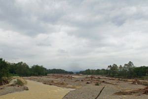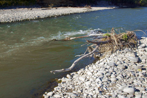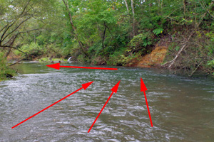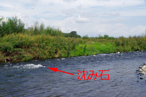 4-3-3.ニジマスは寒波に弱い ニジマスは想像以上にデリケートな魚であり、初夏や9月以降の季節は、寒波が入り気温が急に下がると、まるで魚がいないのでは無いかと錯覚するほど、終日、全く釣れなくなる事が良くあります。数日後に寒波が抜け、暖かい空気が覆い始めると、突然、釣れ出します。 4-3-4.有名河川で釣れる日と時合いを簡単に知る方法 (1) 地元釣り師の活性 釣り人の非常に多い有名河川では、渓畔の駐車スペースに地元ナンバーの釣り師の車が多数停車している日や時間帯が、間違いなくニジマスの活性の高い状態となります。多数の車が停車しているのを見るとガッカリしますが、逆にチャンスなのです。地元ナンバーとは、道東であれば帯広・十勝や釧路・知床ナンバーになります。 (2) ツバメなどの鳥の活性 初夏や初秋などに限りますが、ツバメなどの鳥の行動を、遠くから双眼鏡などで確かめる方法があります。活性が高く釣れる時間帯は、羽化した水棲昆虫が河川上に飛び出す時間帯でもあるため、その虫を食べる鳥たちが河川の上空を盛んに飛び回ります。 4-4.ニジマスの付き場 渓魚の付き場は季節により変化するものです。しかしながら、筆者は6〜11月初までしか北海道に滞在しておらず、冬季〜春にかけての状況は良く判りません。以下は初夏から晩秋にかけての説明となります。 4-4-1.大物は深い場所 大物は沢山の水が集まり、1m以上も深くなっている場所の底に定位している事がほとんどです。強い流れが土手にぶつかる場所(ブツカリ・写真下左)は、深く掘れて大物が集まりやすい場所となります。流れの強い場所に有る大きな沈み石・障害物・橋脚なども、その周囲が深く掘れていて、大物が定位します(写真下中央)。また、渓の強い屈曲部には水流が集まって深く掘れ、良いポイントとなります(写真下右)。