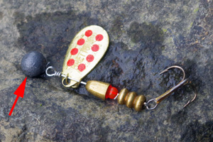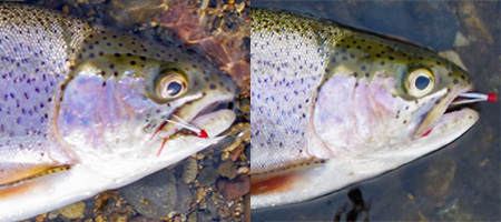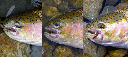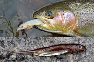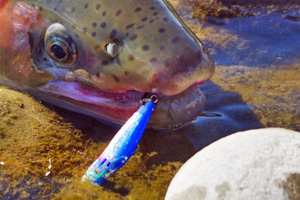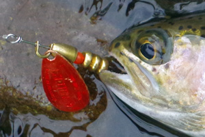 4-4-2.初夏は浅い場所にも大物 初夏の水棲昆虫の大量に流れてくる時期は、強い流れの浅い瀬に大物が定位している事があります。水深がほんの20cmほどしか無い強い流れの中で、突然、大物がヒットしてきたりして驚かされます。ドライフライでの大物釣りのチャンスでもあります。 4-4-3.激流・泥濁りは緩流帯に大物 豪雨で激流・泥濁りとなると、魚たちは激流脇にできる巻き戻しなどの緩流帯で、ある程度の深さのある場所に逃げ込んで退避しています。そんな場所に良く光る重いスプーンやミノーを投入して底で踊らせると、驚く様な大物がヒットしてくる事があります。白っぽい良く目立つ大き目のフライを、底付近で踊らせることでも釣れます。 4-4-4.猛暑下の高水温時は湧き水のあるポイント 猛暑で気温が30℃を超える様な場合は、低水温を求めて、湧き水のある狭い場所に魚たちが集まります。特に十勝平野や根釧原野では、泥質岩層と砂礫層の重なった地形が多く、平野部では湧き水(12℃前後)が良く見られます。真冬になると湧き水からは靄が発生するため、湧き水のある場所を特定できます。 4-5.アプローチ 本州のイワナやヤマメでは、「石化け木化け」と言われるほどにアプローチには気を付けなければいけませんが、野生化したニジマスは意外にも大胆で、活性の高い状況下であれば、ほんの数mも離れていれば、ルアーやフライに喰い付いてきます。多くの釣り人が、水中をジャバジャバと歩きながら釣っています。 しかし、活性がそれほど高くなく、なおかつジンクリアな場所では、やはりできるだけポイントから離れて釣るべきです。また、釣り人の多い有名河川でも同様です。もっとも、北海道のニジマスの釣り場は、水量の多い本流が多く、殆どの場合に透明度が低めであるため、あまりアプローチに気を使う必要はありません。 4-6.タックル タックルについては釣り人それぞれのこだわりや好き嫌いがあり、ご自分なりに考えて選ばれれば良いと思います。この稿では、ごく一般的なタックルについて説明しています。また、フライフィッシングについては、主に筆者の使用しているタックルの紹介に留めます。 4-6-1.ルアーフィッシングの一般的なタックル (1) ロッド、リール、ライン 50cmを超える野生化ニジマスのパワーとスピードは、本州のイワナ・ヤマメとは全く異なり、凄まじいものがあります。そのため、タックルは本州の渓流釣り用よりも一回り大きなものを選ぶ必要があります。特にリーダーは2号程度以上の強いものを選びます。本州で多用される1号以下のものは殆ど使い物になりません。下記は道内で一般的に良く使用されていると思われるタックルの一例です。 ・ロッド:7〜8ft・先調子のL〜ML ・リール:スピニング2500〜3000番 ・ライン:PE15lb(0.8号)以上 ・リーダー:ナイロン又はフロロ8lb(2号)以上をロッドの長さ程度 (2) ルアー ニジマス釣りにおいて、最も良く釣れるルアーは小型のスピナーです。スピナーが虫に見えているのかも知れません。ただ、スピナーは小型のニジマスが先に喰い付いてくる事が多く、また、浮き上がりやすいため、大型を狙って釣りたい場合には向きません。また、流れが無く平らな水面の場所では釣れません。 ・最も良く釣れるのは小型のスピナー。Bretton金赤/銀赤/#1/#2など。但し、小型ニジマスが中心。止水では釣れない。 ・浮き上がりを防ぐため、ロッドの先端を水面下に突っ込み、リーリングします。 ・飛距離を稼ぐのと同時に沈めるため、1号程度の中通し錘をスピナーの手前に取り付けて使うこともある。(写真下左) 初夏を除き、大物は深く掘れたポイントの底を釣る必要があります。また、大型のニジマスは、ジャンプと縦回転を繰り返し、必死で鉤を外そうとしてきます。 ・深い場所の底を釣るため、ディープダイバーミノーやスプーン、場合によってはジグを多用します。 ・大暴れするため、大きなミノーのトリプルやシングルフックの直結はヒットしても殆どがバレてしまいます。 6cm程度以上のミノーでは、腹部フックを無くし、尾部を段差ダブルフックに変える事でバレを激減できます。(写真下中央) ・大型のニジマスはドジョウなどの小魚も捕食しているため、ドジョウ型ワームでも大型を狙えます。(写真二つ下右) その他 ・赤・緑の油性マジックで、スピナーのブレイドやミノーの腹部を塗装することで、釣果が上がる事があります。(写真下右) ・スプーンの後方30cmほどにフライを繋ぎ(トレーラー)、下流側へ流すと小ニジマスが簡単に釣れます。
