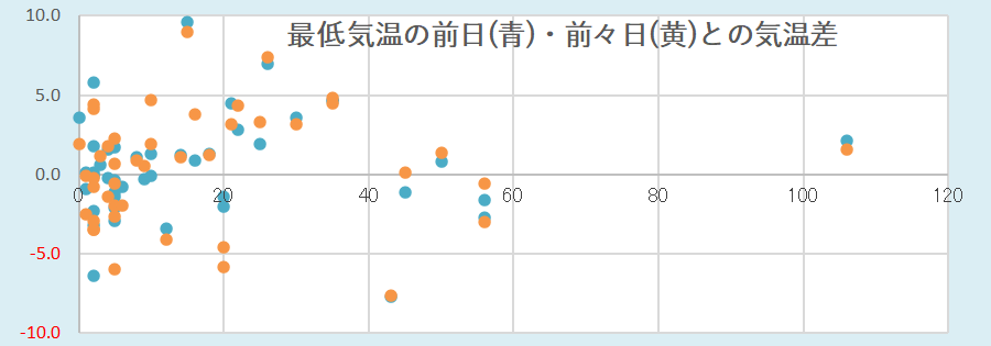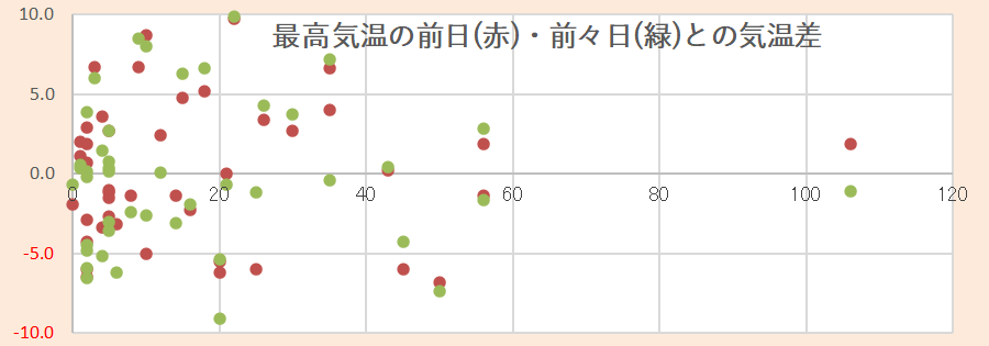 もう一点、この定点観測で判った事は、上の2枚の写真の示す通り、ニジマス達は全く同じポイントで1ヵ月以上も泳いでいたと言う事実です。恐らく、他のニジマス達も、同じポイント付近で泳いでいたのではないかと考えられ、9月30日の降雨までは、同ポイントに40cm以上が4尾、他に10尾以上のニジマスが泳いでいたのではないかと想像しています。釣れないだけで、思った以上に魚影は濃い様です。 そして、9月末の降雨により、50cmを超える1尾がこのポイントに移動して来たのではないかと考えられます。ある程度の量の降雨が無い限り、魚たちは同じポイント付近で泳いでいて、増水時に移動が起こるのではないかと考えています。そのため、降雨が無いと、同じ人が同じポイントへ入渓し続けても、その人にスレてしまい、あまり良い釣果が見られなくなるのではないかとも思われます。 3-2.2011〜2018年の音更川における釣果と気温などとの関係解析(2018年7月既出) 2014年を除く2011年からの6年半(6/7/9/10月)の間に、十勝の音更川で217尾のニジマスを釣っています。野生化したニジマスはとても気難しい魚で、急に寒くなると釣れなくなり、昼間の気温の上がる変な時間帯に突然釣れ始めたりします。その関係を過去のデータから探ってみようと試みたものです。 釣果を30cm未満、30cm台、40cm台、50cm以上の4群に分け、群ごとの過去に釣れた総尾数の割合の逆数に定数を掛け合わせて1尾当たりの点数としました。尺未満=1点、30cm台=5点、40cm台=10点、50cm以上=30点となります。この点数を用いて、釣行日1日ごとの釣果を点数化し、日々の点数と気象庁発表のその日の気温などのデータの間の関係性を解析しました。 3-2-1.前日・前々日からの気温の変化と釣果 左下図は、前日もしくは前々日からの最高気温の変化(縦軸)と日々の釣果点数(横軸)の関係を表す散布図です。前日から気温が大きく上がるほど釣果が上がると想定していましたが、実際には全くと言って良いほど関係性は有りませんでした。また、最低気温の前日・前々日との気温差についても、やはり何ら傾向は見られていません。