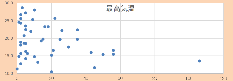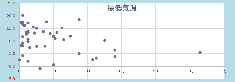 これは恐らく、その日のうちで水温が活動に適した温度に上がった時に活性が高くなるだけで、前日との気温差は関係が無いという事の様です。また、寒波などで昼間に活動に適した水温まで上がらない様な日は、やはり大物は釣れないのではないかと考えられます。 3-2-2.最高気温・最低気温と釣果 一方で、その日の最高気温、最低気温については、以下の様な傾向がみられる様です。 ・最高気温が15℃前後に、最低気温が7℃前後に最も釣果点数が上がる(大物が釣れやすい)。 ・最高気温が高くなるほど大物は釣りづらくなり、30℃に近づくと大物はほぼ釣れない。