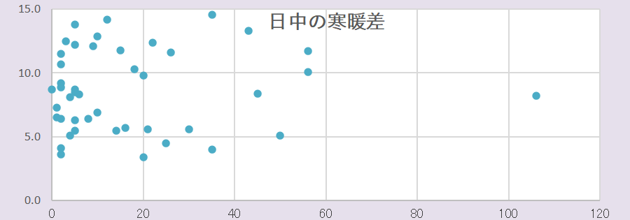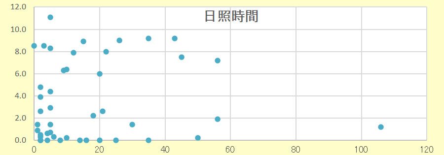 3-2-3.日照時間・日中の寒暖差と釣果 最後に、日照時間については、8時間とゼロ時間付近に2極化している様にも見えますが、全体としては曇った日の方が良く釣れる様です。カンカン照りの日のお昼前ころに、突然、大物が釣れたりすることが良くありますが、これは、晴れて急激に水温が上がり、活性が一気に上がるためではないかと考えています。日中の寒暖差については何ら傾向は見られませんでした。