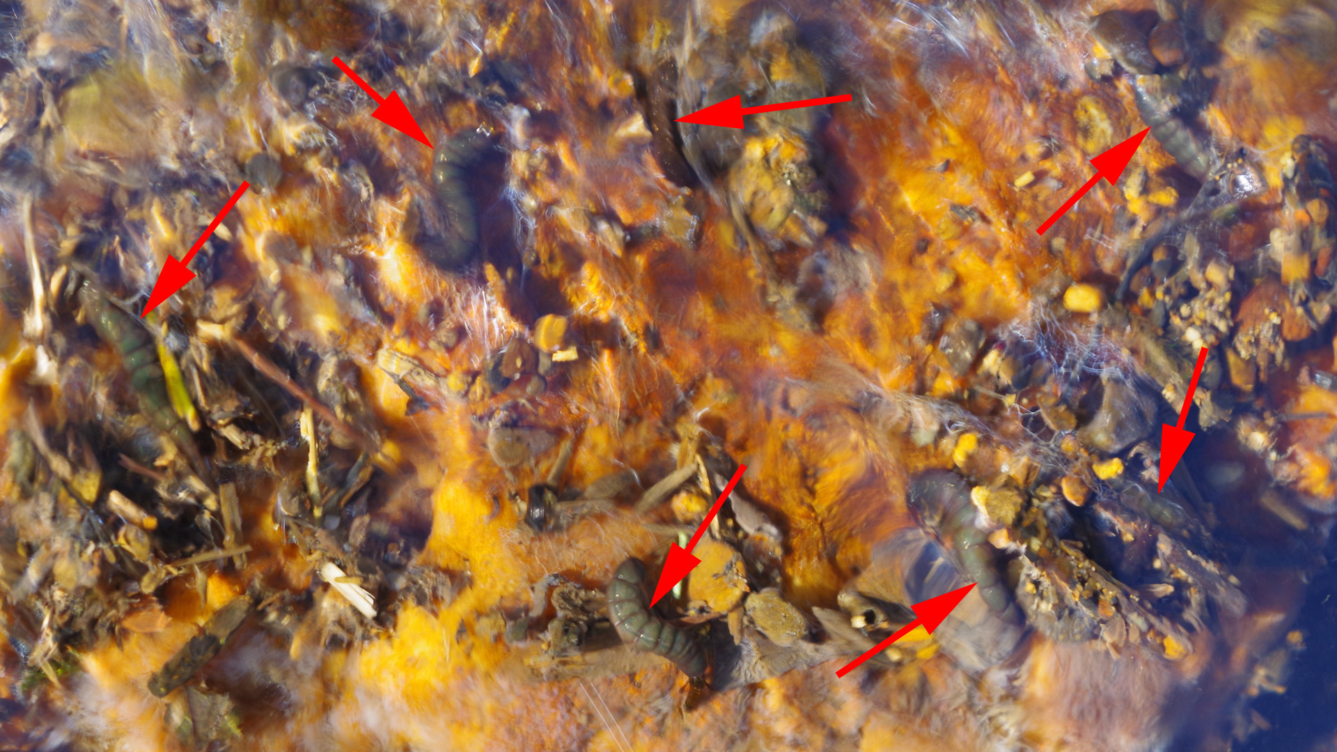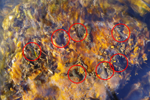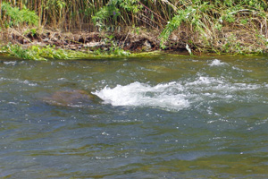早朝の薄暗い4〜5時ころにも何度か出漁していますが、残念ながら私には小さなニジマス以外は釣れていません。早朝には数は釣れますが、恐らく空腹な一部のニジマスが我慢できずにフライに喰い付いてきているだけで、大物はどこかでまだ寝ているのではないかと思われます。寒波などが無く、夕刻まで良く晴れた暖かい日には、日暮れ前にも良く釣れる時間帯があります。これらの状況はレイクトローリングと同様です。 なお、水中カメラで沈み石の下流部を観察していますが、驚いた事に、釣れない時間帯には魚影が見えませんが、釣れ始めると小さなニジマスの魚影が見える様になります。又、流れの殆ど無い場所に、大型のニジマスがジッと隠れている姿を、これまでに何度か目撃しています。水棲昆虫の羽化が始まるまでは、ニジマス達はどこかに隠れて休んでいる様です。沢山の釣り人が通った後でも活性が上がると急に釣れ出すのは、このためだと考えています。 3-1-2.ニジマスの移動