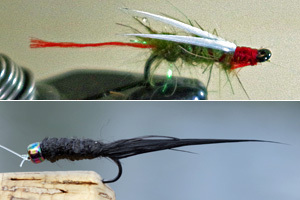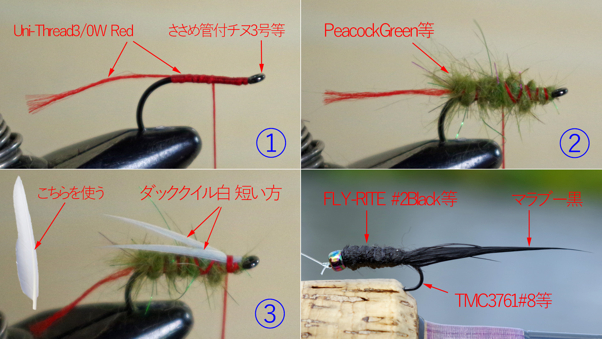 4-6-2.フライフィッシングのタックル (1) ロッド、リール、ライン 筆者はフライフィッシングには精通していませんので、詳しい解説は控えさせて頂きます。ただ、北海道のニジマスに関しては、ルアーよりもフライフィッシングの方が圧倒的に良く釣れるのは事実です。本州ではフライフィッシングは過去の釣りになりつつありますが、北海道では現在も主流となっています。 フライフィッシングでは、好みに応じて様々なタックルが使われています。又、場所と釣り方によりタックルを取り替え、釣っている人がほとんどです。大きな河川ではシューティングヘッドやダブルハンドを使っている釣り人もいる一方で、狭い渓では、6ft前後#3〜4程度のショートロッドを多用する釣り人もいる様です。 下記のタックルは筆者の使用しているものです。ごく一般的な本流の釣り場では、#6程度のロッドにWF-6Fライン、ティペット2x程度を装着して釣っている人が多い様です。ライン切れが多発するため、本州の渓流の様な4x以下のティペットは殆ど使いません。 筆者の使用タックル(これがベストとは限りません) ・ロッド:Brookstone906 9ft#6 ・リール:Echo Ion Fly Reel #4/5 ・ライン:ノーブランド WF-6F ・リーダー:Tiemco Standard 0X9F ・ティペット:GrandMax Fx 2号/2x (2) フライ 初夏の最盛期を除いて、大型のニジマスを狙うには、深く掘れた場所の底を釣る必要があります。そのため、ドライフライでは、どうしても小物が中心になってしまいます。深い所を積極的に攻めるため、筆者はアウトリガーニンフを多用しています。しかしながら、一般的にはドライフライに人気があり、こだわる人も多い様です。 ・筆者の良く使っているフライは、プリンスフライ、クロカワ虫フライ、ブナ虫フライなど。(写真下左) フライから30cmほど離した所に、2B〜4Bのかみ潰し錘を取り付け、アウトリガーニンフ釣法で釣っています。 ・濁りがある渓では、赤や白のコントラストの強いフライを良く使います。 ・釣り人の多い有名河川では、管理釣り場で使用するトラウトガムやエッグ、オクトパスなどが奏功する事があります。 筆者の良く行く十勝の音更川は非常に特異的な河川であり、クロカワ虫が大量に発生しています。大きな石の裏側には、何匹ものクロカワ虫を見つける事ができます(写真下中央)。餌が豊富なため、魚影が極めて濃いと考えています。音更川ではクロカワ虫フライを良く使います。適度に濁っているため、赤と白のプリンスフライも奏功します。