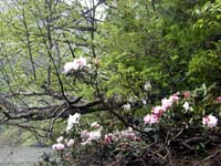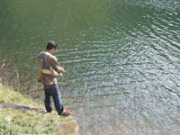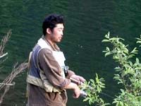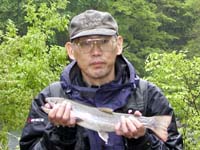 さて、翌朝すっかり明るくなって起き出してみると、またまたどこかで見覚えのある人が近づいてきます。おやおや、今度は2年ぶりの再会となる関川村の大沼君でした。彼とは一昨年のゴールデンウィークに、風の又三郎さんと一緒に、この付近でミニオフ(荒川ミニオフと連休釣行・00年5月5日)で楽しんだ仲でした。そういえばあの時もこのダム湖に案内し、結構なサイズのイワナを爆釣したものです。大沼君はそれ以来、このダム湖に時々来ているそうで、毎回、結構な釣果を上げていたらしいのです。2年前は高校生だった彼も、今では大学生になり、車の運転免許も取得して、すっかり大人びて立派になっていました。