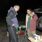 この日の夜は、またまた渓遊会のメンバーがこのダム湖の駐車場にやってきました。彼らは私を置き去りにして小国町の某沢に入っていましたが、尺前後のイワナが随分と釣れたとのこと、くやしいったら有りません。彼らの収穫して来た山菜やイワナをオコボレ頂戴し、早速山菜パーティです。しかし3日連続の野営も疲れますネ。連日の酒びたりで、足の痛みだけではなく、肝臓の方まで痛み出しそうでした。翌朝こそは夜明けと同時に起きて大物を狙おうと心に誓っていたのですが、結局は深酒をしてしまい、翌朝の釣りが疎かになってしまうのでした。