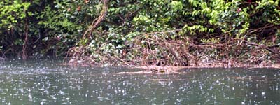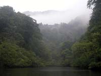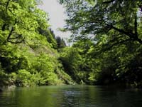 幸いにもプカプカとやっていると意外にも楽チンで、足の痛みも殆ど感じなくて済みました。そして、両岸を切り立った崖に囲まれたバックウォーター付近まで行くと、やがて上の写真の様な異様なゴミ(流木)の固まりに出くわしました。この時期は上流から沢山の細かな流木が流れて来ていて、流れが消えるあたりにゴッソリ溜まっているのです。そして案の定、このゴミの手前では水温は15℃もあるのに、ゴミの向こう側は川の流れそのもので、水温はただの6℃しかありませんでした。