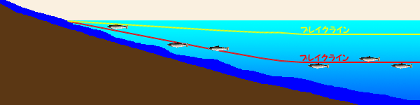 さて、上記の情報は一体、何を意味するのでしょう? 表層の水温が15℃と異常に高いことを考え合わせると、答えは一つしかありません。「早すぎる春」のせいで上昇してしまった水温のため、魚達は既に深いところに移動してしまい、表層近くではもう普通には釣れない状態になっていたと考えられたのでした。堰堤プールの様な小さな水系では問題になりませんが、長さ数kmにもおよぶダム湖では、通常、下図の様に魚たちの泳層(ブレイクライン)が形成されているものです。 この時期の水温は表層ほど暖かく下層ほど冷たくなっていて、流れのあるバックウォーター付近を除けば、魚達は自らの適水温に近い層を回遊しているものと考えられます。例年のこの時期なら表層の水温は10℃以下のハズであり、ブレイクラインは表層もしくはごく浅いところ(黄色いライン)に有ったと考えられます。ところが今年は水温が早期から上昇してしまい、ブレイクラインが予想以上に深いところ(赤いライン)に移動してしまったと考えられるのです。つまり非常に深いところに魚達は移動していて、岸からは普通にはもう釣れないのです。(これがダム湖での釣期の終了を意味していると考えられます)
