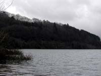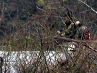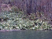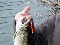 このダム湖も午前中のダム湖と同じ様な雰囲気の、いかにも釣れそうな釣り場です。ただ違っていたのは、回りが山に囲まれていて風の影響が少なく、なぜか随分と暖かく感じます。ここでは釣り始めてすぐに、Buuさんがいきなり2連続ヒット。しかしいずれも足元まで来たものの惜しくもバラしてしまいました。1尾は40cmクラスの大バラシだった様で、うーーん、なんとも勿体無い。まだ一度もアタリもなく焦った私は、ここでちょっと節操のないことをやってしまいました。奥の手のフローターを持ち出し、対岸のまだ誰も攻めていないポイントを沖側から攻めてみることにしました。 遠くにBuuさんたち3人がキャストする姿が見えます。最初は念のためにと緑のKルアーから始め、ナチュラルカラーのWavyもキャストしてみましたが、さっぱり反応がありません。仕方なく、これまで渓流では使ったこともないド派手なレッドヘッドのWavyを3つ目のタックルボックスから取り出し、試しに投げてみました。しかしどうでしょう、驚いたことに2投目で下写真の31cmの元気なイワナ君がブッシュ(下右写真)の脇から喰らいついてきたのです。こんなこともあるのですね。まったく、女心と魚心は、いつになっても理解できません。わたしゃ、まだまだ修行が足りませんなぁ。