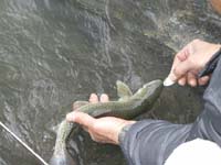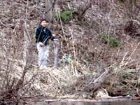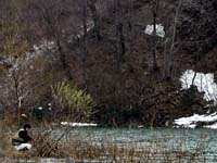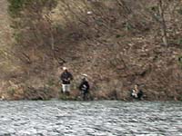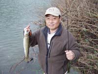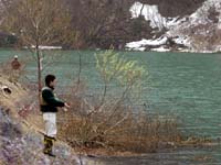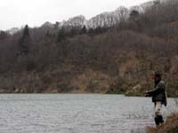 9時ころになり、今度はBuuさんが現れました。彼は別のダム湖で早朝からやっていて、既に上写真の41.5cmの大物を仕留めたのことで、もうすっかり余裕の表情です。釣れたルアーはご覧の「赤」の鮮やかなスプーンだったそうですが、この時点では、まだ誰も今日のイワナ君たちの気持ちが判ってはいませんでした。その後、もうお一人のルアーマン(下左写真)がやってこられたのですが、はて?このかたもどこかで見たことの有る様な・・・しかし、思い出せません。いずれにせよ、この時期にこの付近のダム湖にやってくる人たちは、みな顔見知りばかりの様です。