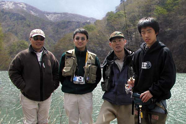 この日は特にミニオフ(ちょっとしたオフラインミーティング)を企画した訳ではありません。掲示板に「そろそろ例のダム湖が良さそうなので行ってみるかも・・・」と私が書いたのがキッカケで、何の打ち合わせもなく新潟の友人たちが一つのダム湖に集まりました。下写真はこの日ご一緒した新潟市のBuuさん、もっちさん、元基くん(たかちゃんさんの息子さん)ですが、他にもpazzuさん、Haruさん、ハチロクさんや、掲示板に来て頂いたことのある「だ」さんも同ダム湖にお見えでした。比較的短い釣期のこの釣りは、同じ目的を持った多くの釣り人を一ヶ所へと集め、それがまた、この釣りの楽しさを膨らませている様です。 ![]() 左から、 Buuさん 、もっちさん 、K++ 、元基くん 私はこの日、早朝6時にこのダム湖に到着したのですが、既に一人の釣り人がルアーを投げておられました。後ほど判ったのですが、この人が「だ」さんだったとは。もう少しお話しさせて頂ければと、ちょっと後悔です。7時ころになり、今度はもっちさんが同じ釣り場に現れました。私が掲示板に「行くかも」と書いていたのを見て、来て見たそうです。しばらく3人でルアーを投げ続けますが、いかんせん風が強くて寒く、「だ」さんのルアーに一度だけイワナがトレースしてきただけで、何の反応もありません。