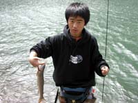 この後、pazzuさんたちがやってきましたが、あまりの人出に驚いたのか、そそくさと別の釣り場に移動されてしまいました。そして、我々の驚きにトドメを指してくれたのは、下写真の元基くんです。彼はBuuさんと一緒に来ていたのですが、眠くてずっと車の中で寝ていたのです。我々が一通りルアーを投げたあと、眠そうな目をこすりながら起きてきた彼は「ちょっとだけやってみる」と、またまた先ほどと同じポイントへ降りて行きました。 しかしどうでしょう、彼は今度はなんと3投目で、下写真の38cmもある立派なイワナ(下中央写真)をあっさりと釣り上げてしまったのです。我々「釣れてない派」はもう唖然とするばかり・・・参りました。ちなみにこの38cmは元基くんの自己記録更新のサイズだった様で、顔がゆるみっぱなしの大喜び。彼はもう、すっかりこの日のヒーローでした。