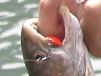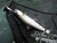 それにしても3人ともちっとも釣れないため、車のそばで談笑をしていると、その釣り人は手早くタックルを用意し、先ほど我々が釣っていたポイントへそそくさと入って行きます。我々がお喋りしながら何気なく見ていると、あれれ?、一投目で竿が曲がっています。そして、しばらくしてイワナのバタバタと暴れる姿が目に入ってきました。サイズは34〜5cm(上中央写真)の様でしたが、あれだけ皆が投げ続けて何の反応もなかったのに、いったいどういうことでしょう。一同、ただただ驚くばかりでした。ヒットルアーは、ちらりと見ただけですが、半分だけ「赤」に塗装されたシルバーのスプーンの様でした。