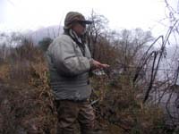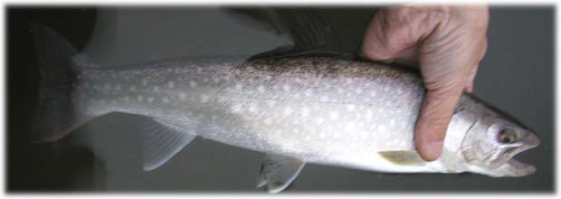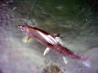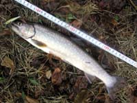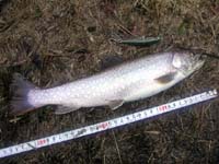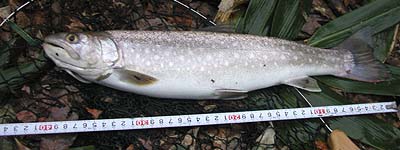 そして8時過ぎ、やや辺りが暖かくなってきたころ、やっと私のロッドに待望のアタリがありました。先の釣り人の情報から、私もMMミノー48S鮎に切り替え、岸際のブッシュのすぐ脇を流していたときです。ブッシュの下から飛び出してきた獲物は36cmのまずまずのサイズ。どうやらこの日のヒットカラーは緑系で、岸際の浅場に付く魚だけが反応を示している様です。そしてその後、同じくナチュラルカラーのディープダイバーでパパイヤさんが38cmのイワナを釣り上げられたのですが、残念ながら私はその時、別のポイントに偵察に行っており、写真を撮影できなかったのがともて残念です。