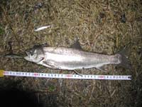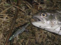 次に今度はストップ&ゴーを試してみました。同じく遠投し沈めてから、今度はハンドルを巻きながら同時に竿をあおり、ミノーを4〜5mほどハイスピードで泳がせた後、竿を戻しながら同時にハンドルを巻き、1秒ほどミノーを水中で止めます。この操作を繰り返しながら、もうミノーがロッドチップの手前1mほどまで来たときでした。後方から勢い良く追いかけてきた黒い影が沖合いへと方向を変えながら、そのミノーに体当たりする姿が見えました。サイズは34.5cmとやや小ぶりですが、諦めかけていた矢先の、しかも作戦通りの1尾に、ようやく顔がほころぶのでした。 これを見ていたBuuさんもすかさずミノーに切り替え、同様のストップ&ゴーで続きます。魚心というのは付近にいる魚たちもあまり変わらない様で、今度は沖合いでミノーをストップした瞬間にガツンと言うアタリがあったそうです。ようやくBuuさんにも待望の1尾がHitし、「粘っていて良かったねー!」と、もう二人とも有頂天になってしまいました。ただ残念ながらもう6時を回っていてかなり暗く、この1尾を最後に、後ろ髪を引かれる思いで釣り場を後にせざるを得ませんでした。