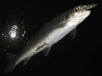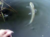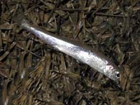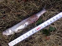 ヒットルアーは某釣り具量販店のカゴ売りで見つけたTideRise7S、480円ナリ。このミノーは昨年も某堰堤で41cmを釣り上げており、どうやら、ルアーのお値段と釣果とは比例しない様ですね。もう一点、この魚の口からは上写真のワカサギが勢い良く飛び出してきました。ダム湖では小魚を主食としているらしく、深い所を狙えないことを除けば、やはりリアルミノーの方が部があるのではないかと考えられました。ちなみに、この日も前週と同じく赤系統のスプーンやミノーを投げてはみましたが、全く反応がみられませんでした。