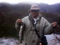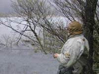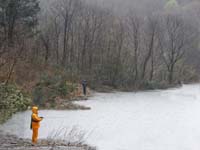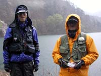 【4月20日(日)】 翌日曜日も雨。この日入った2つ目のダム湖は、前週とは異なり、たった1週間で山肌の広葉樹が新緑に輝いていました。この時期は朝と夕方で色調が変わってしまうほど新緑が一気に成長します。どんよりと曇った空と冷たい雨で気が滅入ってしまう状況の中、この新緑だけが気持ちを明るくしてくれます。現場に6時頃到着しましたが、土砂降りに近い雨にも関わらず、すでに一人の釣り人がルアーを投げていました。一尾だけ岸沿いになげた緑系のミノーにヒットがあったものの、途中でバラしてしまったとのこと。魚の活性はなんとか保たれている様でした。 ![]() 7時ころ、今度は左下写真の二人の釣り人が現れ、4人で釣り始めます。お二人(パパイヤさん、ますおさん)には今回始めてお会いしましたが、お二人とも私のサイトへは何度か訪問して頂いていた様で、同じトラウトルアーを楽しむもの同士、すぐに打ち解けて情報交換の場になってしまいました。お二人ともサイトルアーパラダイス新潟のメンバーとのことで、この時期にはあちこちのダム湖によく出没されているとのことでした。