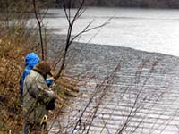 早春のダム湖の釣りは釣期がとても短く、しかも大物が釣れる確立が高いため、どうしても足しげく釣り場に通ってしまいます。前週に今年初めてのダム湖のイワナ釣りに出かけた私は、なんとかボウズは免れたものの、どうも納得が行きません。と言うのも、ミニオフの複数のメンバーが40cm前後の大物を釣り上げていて、背中に火を付けられてしまった格好でした。幸いにもこの週も何も用事が入っていません。これは出漁するしかないのです。今回は4月19・20日の土日の両日にわたって、再び幾つかの複数のダム湖を巡ってきました。 ![]() 【4月19日(土)】 ホームページなどのNetの活動をしていると、こちらから多数の情報を発信すると同時に、実に様々な情報が入って来る様にもなるものです。今回訪れた釣り場も1箇所は自分自身で開拓した釣り場ですが、もう一箇所はNet仲間のBuuさんからポイントを教えて頂いたものです。昨年からBuuさんには幾つかの貴重な釣り場の情報を教えて頂いており、Netのありがたさをしみじみと感じる結果となっています。Buuさんには、この場を借りて、お礼を申し上げます。