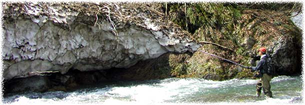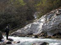今年の冬は3月まで寒冷な気候が続いたため、寒河江地区など、南東北の残雪は予想以上に多いものがありました。ホームグラウンドにしている堰堤プールの林道も、5月6日の連休最終日でさえ残雪で未だに通れないほどで、昨年より1週間以上も遅い状態です。毎年、連休の前半を山形渓遊会の春季釣行に当てることに決めていますが、どうやら山形県内の各渓流は、わずかな遡行ですぐに雪渓に埋もれて釣りに成りそうに有りません。やはり渓遊会の釣行では、源流部のできるだけ奥まで、ゆっくりと時間を掛けて釣り遡りたいものです。