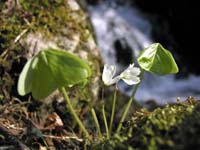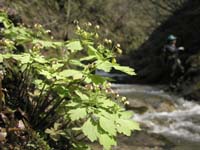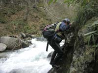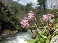 しかしこの時期の源流遡行は実に楽しく気持ちの良いものですね。足元にはショウジョウバカマやキクザキイチゲなどの春告花が咲き乱れ、頭上には眩しいほどの新緑です。渓の水は清冽で、付近は春の息吹に満ち溢れています。幸いにもお天気は雲一つない快晴。まだ4月だと言うのに、遡行していると心地よい汗が体中から噴出してきます。空の青、木々の緑、残雪の白、その中にピンクや紫、白や黄色の小さな野草花のカラフルな光線が目に飛び込んできて、一日中、飽きることがありません。