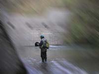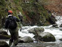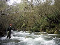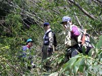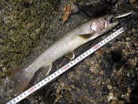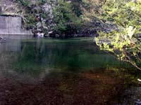 この沢をあきらめて、仕方なく別の小さな本流にでも入ろうかと辺りを探っていた時でした。この沢には真新しい堰堤が幾つも建設されていて、その一番上流側の堰堤の上に出来た小さなプールを覗いた時でした。比較的透明度の高いプールのバックウォーター部には、どうみても40cm以上、50cm近いイワナが1尾、泳いでいるのが見えるではありませんか。会長たちはその本流にさっさと入ってしまいましたが、私はそのイワナを見てしまったために、もう気になって仕方有りません。一人別行動を決め込んでしまいました。