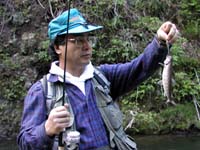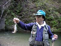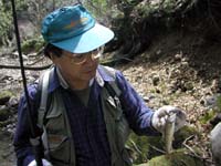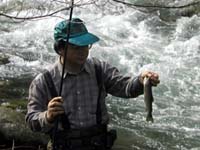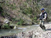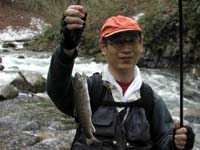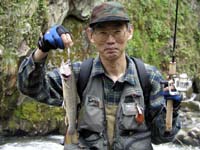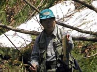 車で小一時間ほど移動したところにあった小さな渓流は、わざわざ支流の沢を選んで入渓したにも関わらず、しっかりと残雪の上には今日のものとしか思えない新しい足跡がありました。それでも昨日から釣れまくっている佐谷名人の竿に、27cmの良型がヒット。しかし、この沢で釣れた他の魚は、会長に来た20cmそこそこの小さなイワナだけ。やはり日が高くなってから移動しても、それなりにしか釣れてはくれません。釣りブームが去ったとは言え、ゴールデンウィークは釣り人が多いのです。
