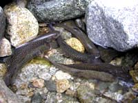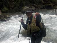 ようやく左右に残雪の壁が見えてきたころ、やおら会長が餌釣りで試し釣りをしてみると、小ぶりではありますが、雪代に磨かれた元気な輝く様なイワナが次々と掛かってきます。残雪には足跡が全く見られず、どうやら源流部に今シーズン入渓したのは、我々が最初の様子でした。しかし疲れました。私はお茶コースのつもりであまり準備もせずに軽い荷物で望んだのですが、最終的に帰りは殆ど仙道の判別できない様なコースを4時間も歩かされてしまいました。お茶を飲みに行ったら、いきなり分厚いステーキを出されてしまった様なものです。