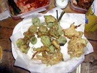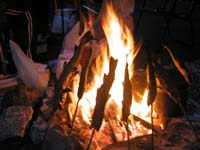 そして夜の部は、この時期の最大の楽しみでもある山菜パーティーです。道中にはまるで「コゴミ畑」とでも呼びたくなる様な立派なコゴミの無数に林立するポイントがあり、帰り道には皆で山菜の採取に大忙し。岩ダラ・ウド・ウルイなどの山菜にも恵まれ、テンプラ・和え物など、満喫させて頂きました。でも、一つだけ残念だったのは、我が会では釣行時に一人一尾のイワナの塩焼きを食べることが許されている訳ですが、私はあまりに分厚いステーキを食べ過ぎたためか、疲れて魚が焼きあがる前に寝てしまったことです。うーん、歳は取りたくないものです。