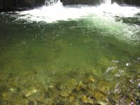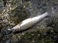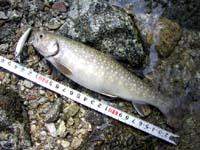 そして、午後になり件の堰堤プールに竿を出しましたが、これが全くなにも釣れません。魚は追いかけてくる様なのですが、釣り座が高く人影が丸見えなのか、大物を目の前にして指を咥えて見ているしかないのです。もっと早い時期に雪代がたっぷり出た状態で釣れば、間違いなく大物をゲットできたのではないかとは思うのですが、残念でなりません。仕方なく、その堰堤の下の落ち込みでお茶を濁そうとルアーを投げると、誰も釣っていなかったのでしょうか、なぜかこちらでは20〜29cmのイワナの入れ食いになってしまいました。1時間ほどで7尾の釣果がみられ、なんとなく満足して下山しました。