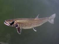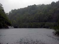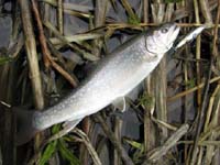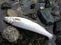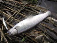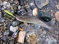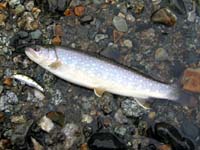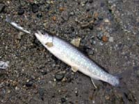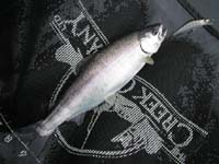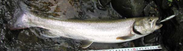 風玉さんと現場に到着してみると、あれま、餌釣り師が一人、一番良いポイントに早々に陣取っていました。でもま、釣り場は広いため、彼の邪魔にならないところでルアーを投げ始めます。すでに魚影は十分で、すぐに25cm前後のイワナが私のロッドにヒットしてきますが、どうも大物の姿が見えません。餌釣り師の竿にも盛んにイワナがヒットしていますが、殆どが25cm前後の小物ばかり。やがて活性がピークに達した午前7時ころ、餌釣り師の竿に連続して大物がヒットしてきましたが、しかしそれでもサイズは33cm止まり。どうもまだ本当の大物は、この堰堤プールには入ってきてはいない様子でした。