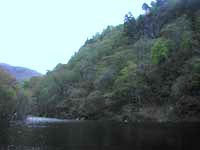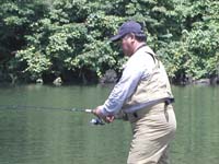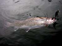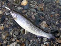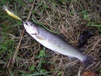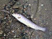 4人は諦めたのかすぐに帰ってしまいましたが、その後またまた3人の顔見知りのルアーマンがやってきました。一緒に4人で10時半ころまで粘りましたがやはりヒットは無し。結局、誰にもヒットはおろか、魚のトレースすらないと言う、惨憺たる状況でした。理由は良く判りませんでしたが、まだ時期が早すぎるのでしょう。この堰堤は実は小さなダム湖になっていて、普通の堰堤とは異なり最深部の水深が12m以上もあります。そのため過去の実績を見てもまるで煙幕理論が通用してくれません。深いところに魚が潜んでいるのかあるいは、まだ上流から魚が入り込んでいないのか、謎の釣り場です。 ![]() あきらめた我々は、その後、離れた別の釣り場に移動しました。しかし、ここで誰にも予想できなかった素晴らしいドラマが待ち受けていたのです。時間は午後0時半ころ。既にあきらめ気味で、しかも真昼間です。釣り場に入った3人は、到底釣れるハズもないと半ばやけくそになってルアーを投げ始めました。ところがどうでしょう、すぐに一人のロッドに尺ちょっとのイワナがヒット。惜しくもバラされてしまいましたが、ここで一気に皆の闘争心が沸きあがります。そして13時ころ、遂に私のロッドに写真上の細身ではありますが46.5cmもある巨大なイワナがヒットしてくれました。長年ルアー釣りをやっていますが、うーん、本当に釣りと言うものは判らないものですね。