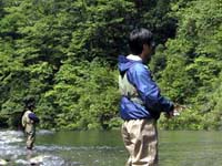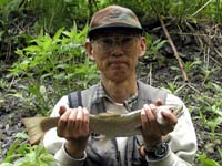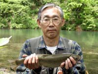 一方、この朝は、風玉さんにはバラシが2回有ったものの、残念ながら釣果には結びつかず、非常に悔しがっておられました。どうやらもっぱら表層を引いておられるため、イワナにアピールが弱かった様子です。トゥィッチングとカウントダウンを覚えて頂き、なんとかヒットはしたものの、バラシされてしまい、ちょっと残念でした。ただ、私は午前中にこの釣り場を後にして、午後からは別の釣り場に向かいましたが、彼はこの堰堤プールで夕方まで粘り、見事に2尾のイワナをゲットされたそうです。おめでとうございました。 【5月22日(土)PM、山形県置賜地方】