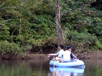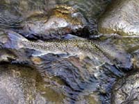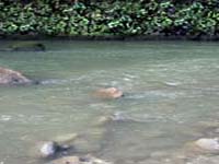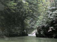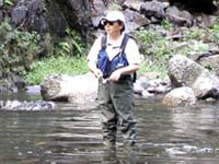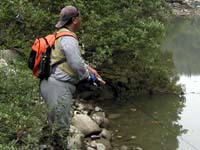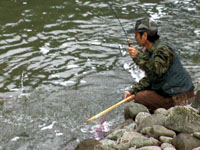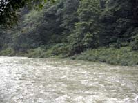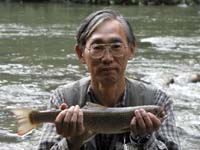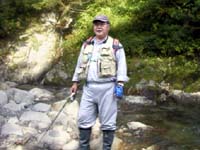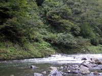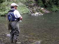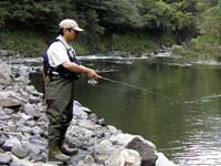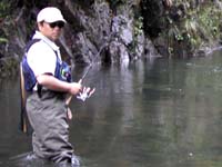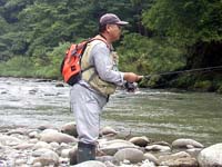 2人で昼食をとった後は、ぐるっと大回りをしてあまり濁りの入らない、とある渓流を選びました。しかしお昼をまわったこの時間帯では、そうそう良い釣りは望めません。我々が釣り始めたころには既に誰かがすっかり場を荒らしたあとらしく、ルアーには全く反応がありません。おかしいなと思って遡行を続けると、やがて上流から4人のルアーマンが下ってきました。どうやらルアーを投げまくりのすぐ後を追いかける様にして釣っていた様です。これでは釣れるハズもありませんねぇ。仕方なくここは写真撮影会になってしまいました。