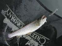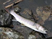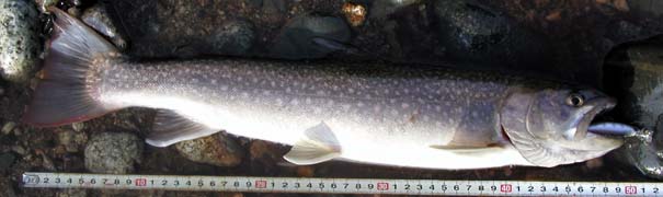 しかし現場に到着して驚いたのは、なんといままで見かけたことのないボートが3艘。1艘はルアー、もう1艘は餌釣り師が2人、もう1艘は諦めたのか、岸に横付けのまま。それでも他に行くところもないので、諦めてフローターを出して釣り始めると、案の定、写真の小ヤマメ・小イワナばかりがヒットしてきます。どうやら大物は朝から彼らにいじめられっぱなしの様で、姿を現してはくれない様でした。・・・この堰堤も来年はもうダメかもと思いながら、約束していた新潟方面へと車を走らせました。