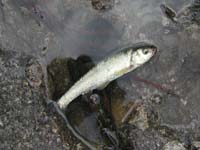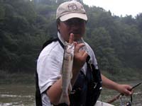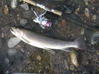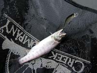 そして釣り始めた直後でした。すぐ後から下流側に入って来た見知らぬ釣り人のロッドが大きく曲がっています(写真上左)。あちゃーー、やられました。急いで近寄ってみると、足元で45cmはあろうかと言う大イワナが身をくねらせています。ただ、ロッドがどうみても渓流用の細身のもので、魚をいなすことができていません。案の定、暫くしてタモを入れ様とした瞬間に、フックが外れてバレてしまいました。なんとまぁ勿体無いこと! その後は2人でお昼ころまで付近を丹念にルアーで探りましたが、釣れてきたのは写真上右の小さなウグイだけ。雨も強くなり、場所を移動することにしました。