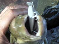 しかも濁りがきついため、浅い見通しの効き易い場所にその魚は陣取っていたのでしょう。ヒットした瞬間は「まさか!」と思いました。なんでこんな浅い場所に? 今考えても不思議です。ただ釣り上げて計測してみると少々がっかりしました。50cmにほんの数ミリ足りないのです。すぐ横で見ていた風玉さんは「それは50cmでしょう」と言ってくれたのですが、納得できません。一応、記録としては49.5cmと言うことに落ち着きましたが、うーん、それにしても残念です。
