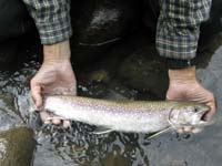 そして夕方になって再びあの大物を見た釣り場に戻ることに。やはりあれだけの大物を目の当たりにしてしまうと、そう簡単にはあきらめがつきません。しかしここで嫌な考えが頭をよぎります。今日は朝から2人とも渓魚の釣果はありません。実はBuuさんと私は「鬼門」の仲なんですねぇ。2人で釣ると、片方だけが釣れるか2人とも撃沈かのいずれしか無いのです。時刻は午後5時を回っています。今日はこれでおしまいかな、と思ったそのときでした。私のロッドにアタリが・・・瞬間的にバレてしまいました。そしてその直後に、同じ場所でBuuさんが写真下の29cmのイワナをゲット。はぁー、いつまで鬼門の関係は続くのでしょうねぇ。
