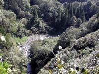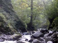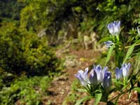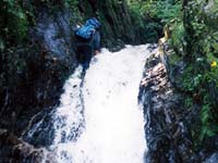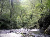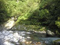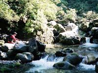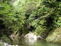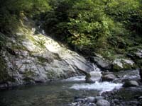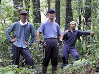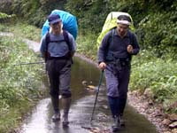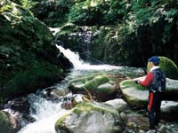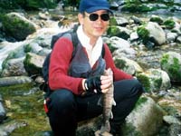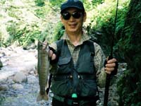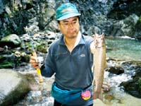 今回の釣行場所は、重いザックを担いで5時間以上もの長い登山道を徒歩で向かわなければなりません。現地には山小屋があり、そこで2〜3泊しながらの、本格的な山釣りの旅でした。なんでも、私より1日早く入山した2人は、お昼ころには山小屋に到着し、付近の本流を散々釣りまくった後、2日目の早朝から数本ある沢と本流の魚止めの滝を目指した様です。上の6枚の写真は、いずれも渡邉会長の銀塩カメラで撮影したものをデジタル化したものですが、他とは少々画質の異なるのが判って頂けると思います。2人とも結構な釣果だった様子で、特に会長さんは、某魚止めの滝で40cmジャストの大物を仕留めることに成功していました。