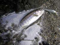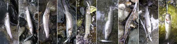 今回の釣行の私の目的は、釣果よりもどちらかと言うと写真撮影でした。そのため、途中で写真を何十枚も撮影しながらあまりにものんびりと歩いたため、通常は5から5時間半の道程を、7時間も掛かってしまいました。山小屋に到着したのはもう午後の3時ころ。それになにやら急激に雲行きが怪しくなってきたこともあり、慌てて山小屋のすぐ下の本流に釣りに降りました。予想通りとは言え、山小屋直下の本流は、やはり相当な釣り人が入っている様です。最初にWavy50Sヤマメにヒットしてきた魚は、写真上中央の小さな小さなイワナ君でした。ただ魚影はそれなりに確認でき、やはりこれだけの山奥まで来る人は少ないようで、しっかりとイワナたちの楽園が残されている様子でした。 ![]() 結局、15時から17時ころまでの2時間だけの単独釣行でしたが、全部で12尾の釣果が見られ、納竿釣行としてはまずまず楽しめました。ただ、ご覧の様にイワナ達はどれも小さく、とても源流の大物は居そうもありません。最後の最後になって、付近が薄暗くなって来た頃、28cmの綺麗なイワナ君(写真下中央)がヒットしてくれ、この魚が今シーズンの最後の渓魚となってくれました。上の魚たちの写真はその時の釣果の一部ですが、源流特有の比較的細かな縦方向のパーマーク様の筋がどの魚にも共通して見られることがお判り頂けると思います。大物こそ釣れませんでしたが、源流育ちのイワナたちは実に綺麗で可愛く、まるで生娘の様に魅力的でした。