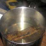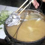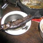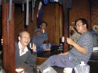 さて、上写真の料理の数々を見て、ギョっとされた方がおられるかもしれません。実は会長と佐谷名人の2人は、40cmの大物を含む数尾のイワナを某沢の魚止めの滝上部に放流しようとしたらしいのです。しかし、高巻きの途中でアクシデント(水漏れ?)に見舞われ、滝上に到着した時にはイワナたちは残念ながら絶命していたとのこと。仕方なくそのイワナを小屋まで持ち帰り、ありがたくご馳走になることにさせてもらった、と言うことでした。でもま、予期せぬご馳走が嬉しく無いと言えばウソになります。私も便乗してありがたくご相伴に預かりました。んー、それにしても疲れた体にあの骨酒のうまかったこと!