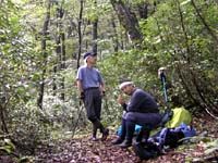 私はと言えば、初日は車の中で10時ころまで爆睡でした。その後、一旦は山を降りて食料や燃料を買出ししたあと、再び同じ場所に戻り、翌日の山歩きに備えて21時ころには一人で寝てしまいました。よほど仕事で疲れていたのでしょうか、翌朝はそれでも起きたのはもう7時ころ。重いザックを担いで、のんびりと山道を歩き始めます。なにせ初めての道程でしたので迷ってしまう可能性もあり、地図と睨めっこでした。一人で歩く寂しい気持ちとは裏腹に、なぜか秋空は青く高く、ブナの森と付近の山々が妙に輝いていました。