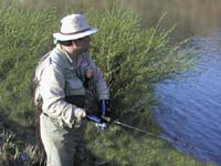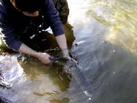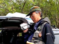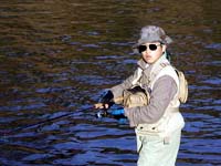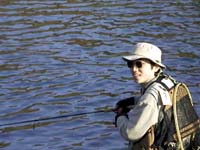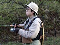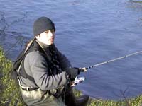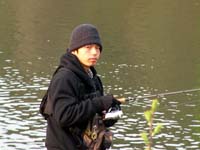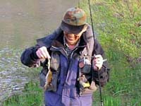 しかし釣り場に行ってみて驚きました。お天気はポカポカ陽気、人は皆無、水も河口ほどは汚くも無く、なによりもポイントが明確に判ります。要するに春のヤマメ釣りの世界と変わらない環境でした。もっとも私自身は現場に到着するまで、「サクラマスなどそう簡単に釣れる訳が無い」と"信じ込んで"いましたので、ロッドは大昔買った9ft、ルアーも当時使っていた古いミノーやスプーンのまま。新しく買ったのは、2号と1.5号のフロロラインくらいでした。当日は最初から、最近購入したばかりのビデオ撮影班と決め込み(写真上右)、いまいち気力が沸きません。