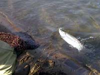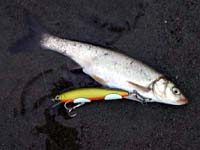 さて、翌日も朝一番からサクラマスを狙いましたが、やはりそう簡単に釣れるものではない様で、この日は写真下の小さなウグイ君が私のロッドにスレ掛かりしたのが唯一の釣果(?)でした。でもま、久々のサクラマス釣りの雰囲気も味わえ、なによりもなべちゃんさんご一家とのキャンプのひと時は、それはそれは楽しいものでした。また、これまで私の持っていたサクラマス釣りの概念を少々変えさせてくれたのも、私にとっては非常に大きな成果であったと言えます。今年はなぜかサクラマスの当たり年と聞いています。まだまだチャンスはありそうですね。