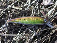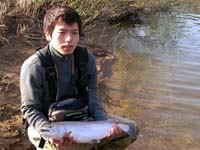 さて、この時使われていたのは写真上左の「ビーフリーズミノー」の腹部に鉛板を4重に貼り付けた特性のもの。非常に重くて、これなら幅広い本流を遠くまで楽々飛ばせます。これをサクラマスの付いていそうなポイントの少し上流へキャストし、軽くトゥィッチを掛けながら底付近を引いてくるとヒットしたそうです。しかし息子さん、やりますね。素直な息子さんで、なべちゃんさんの言うとおりに忠実にルアー操作とポイントを守ったのが、釣果に繋がったのではないかと思います。しかしなんですね、サクラマスって、ヤマメのポイントと何も変わりませんね。ヤマメ釣りをそのまま大型にした様に思えました。