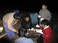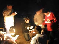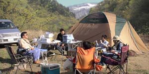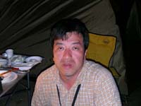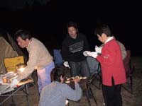 さて、上写真はキャンプサイトの様子と、なべちゃんさんご一家+私のスナップですが、今回はご家族に大変お世話になってしまいました。予備知識の無い私は、忙しさも手伝ってなにも用意をして行きませんでしたが、写真下のように、夜はご一家の用意されたBBQをご馳走になり、すっかりくつろいでしまいました。普段、掲示板でお話をしている訳ですが、お酒を呑みながらの団欒のひと時は、また違った雰囲気で、様々な話題が出てきて楽しいものです。