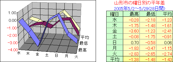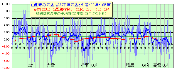 今年の気候は何だか変です。東北では5月に入っても肌寒い日が続き、ダム湖のイワナがまだ釣れ続けています。それでも確実に水温は上昇している様であり、そろそろ堰堤プールの釣りが開幕した様です。5月末ころから7月の梅雨明けまでの短い間ですが、堰堤の釣りを楽しむものにとって、1年で最もエキサイティングな季節がこれから始まります。今シーズンのダム湖では大物ラッシュが続いていましたが、こういった年は堰堤プールの釣りでも同様に期待できそうです。早速の大物が、今年も釣れています。 ![]() とにかく今年は季節の移り変わりが遅い様です。下の図は山形市の02年以降の平均気温との差を示したものですが、今年は1月以降、平年よりもかなり低い気温が非常に長い間続いていることが判ります。ちなみに下図は山形市の気温の変化ですが、これは東北全体でもほぼ同じ状態であることを示しています。この5ヶ月間は平均よりも概ね1.5℃ほど低く推移していて、これは5月であれば約8日の季節の遅れであることが判ります。ただ、こういった気候の後は、逆に猛烈に暑い気候に変化することが多いものです。今年の夏はまたまた猛暑になるのでしょうか。 ![]() そして、今年の豪雪のお陰で、いまだに残雪で行くてを阻まれている林道が存在するほどです。今年はあちこちで車が入れず頻繁に歩かされたのはこれまでのレポートの通りですが、お陰で随分と足が丈夫になった様な気がします。夏の源流釣りに向けての体力補強が自然に出来ているのは嬉しいのですが、それにしても疲れる年ですね。ただ幸いにも、土日にとても暖かくなる気候でもあり、これは私の様なサンデーアングラーにはとても嬉しいものです。大物に恵まれた理由は、単に残雪が多かっただけでもなさそうです。 ![]() 【5月22日(日)】