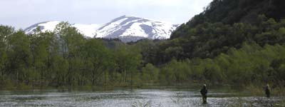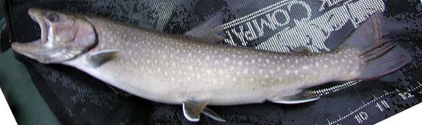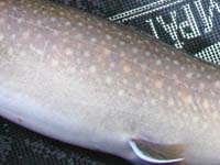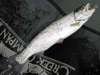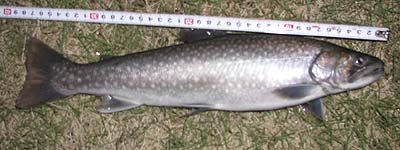 雲を掴む様な気分の中、それでもインレットに近づくにつれ、やがて魚影が現れはじめました。どうやら、魚はまだ少ないものの雪代に流されて源流部からイワナたちが落ちてきてはいる様です。インレットから500mほど離れたところでまず28cmほどの小ぶりのイワナがヒット。続いてほぼ同じところで27cmもヒット。やはりまだ小物しか入っていないのか、と諦め始めていたころ、一度ミノーを投げて反応が無かった場所に念のためルアーを投げなおし、今度はゆっくりとした2段引きを試みてみると、いきなり写真下の42cmの丸々と太ったイワナがヒットしてきました。数こそ少ないものの、まずまずの魚影と大きさに、今年の堰堤プールの釣りも約束されたという安堵感に包まれ、この日は納竿としました。 ![]() ところで私がこの堰堤プールのルアーフィッシングにこだわるのは一体なぜなのでしょう。自分自身でも良く判ってはいなかったのですが、今回のこの大物を見るにつけ、その理由が判った様な気がします。今年、既にダム湖で40cmを超えるイワナ・アメマスを5尾ほど釣り上げていますが、なぜか堰堤で釣るイワナとは感動の大きさが違うのです。その理由は、上写真の42cmと、連休のダム湖の大物と、写真を良く見比べて頂ければ判るはずです。 ダム湖や本流での大物は、その一部を除いて概ね幼い顔をしており、しかも斑点がとても大きいのです。これは広大なダムや本流でワカサギやウグイなどを捕食して急速に大型化した証拠であり、40cmを超えてもその年齢は恐らく2〜3年でしょう。また、ダム湖や本流の魚たちはそのエリアの広さから、釣り人のプレッシャーにあまり晒されることもなく、安泰のうちに大型化してゆくと考えられます。(ダムでも少数ながら源流育ちのイワナは釣れます)