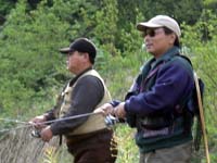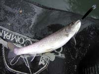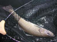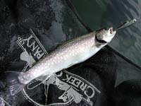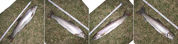 前日に仕事で動けなかった私は、この日、珍しく寝ずに翌朝の釣りに臨みました。しかし、せっかく朝一番に某ダム湖に入ったものの、なぜか釣れるのは写真上右の様なヒレがボロボロになった、どう見ても放流したてとしか思えない様な小さなニジマスばかり。大物も泳いでいるのでしょうが、警戒心の少ないニジマスが先に喰いついてしまうためか、イワナはさっぱり釣れてくれません。それにしても一体誰なんでしょうね、こんな「雑巾マス」(引きが弱くゾウキンを引っ掛けた様な感じがするため。福島の某氏が命名)を大量に放流したのは。折角の大物釣りもこれでは台無しです。