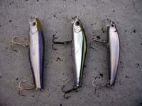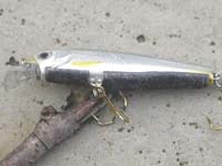 その結果、写真上の様に5cm前後のミノーに鉛板をたっぷりと貼り付けて重くしたものを幾つも持ち歩く様になりました。今回の堰堤プールでは、この重いミノーが底を釣るのに大変役立ったと言う訳です。ただ、これらのミノーは決して動きが良くはありません。むしろ、普通のミノーの様な綺麗なウォブリングは殆ど期待できません。そのため、ロッドワークにより喰わせる要素が高くなってしまい、慣れないと根がかりばかりでサッパリ釣れないと言った結果になり易いですので、ご注意下さい。あくまで、きめ細かなロッドワークでミノーを泳がせなければ釣りになりません。